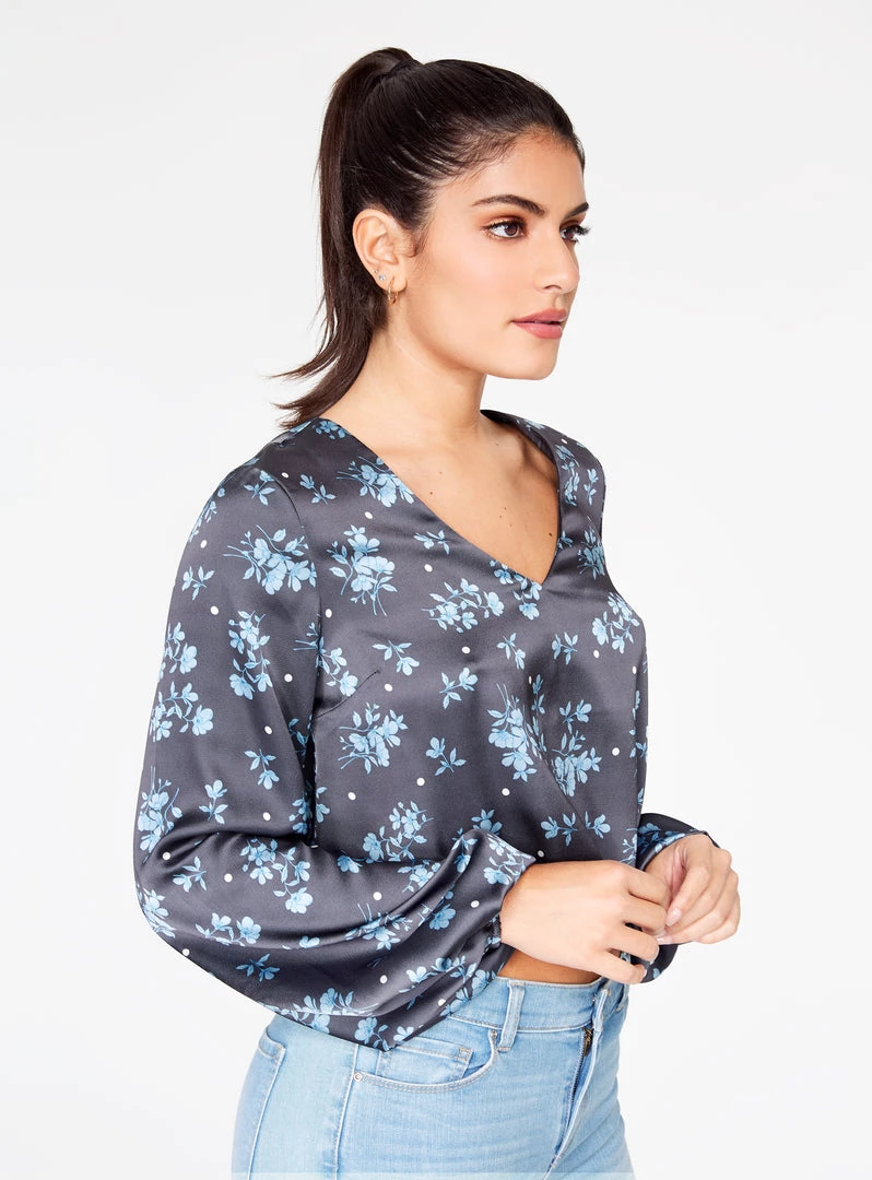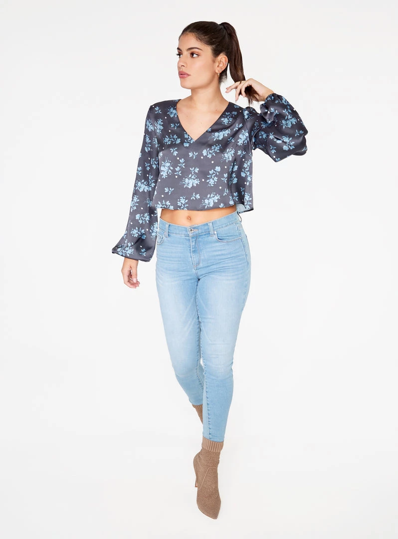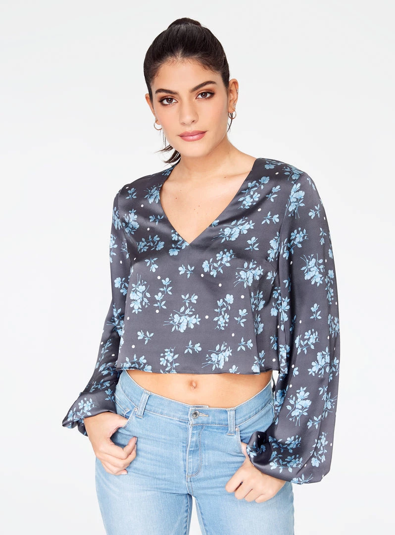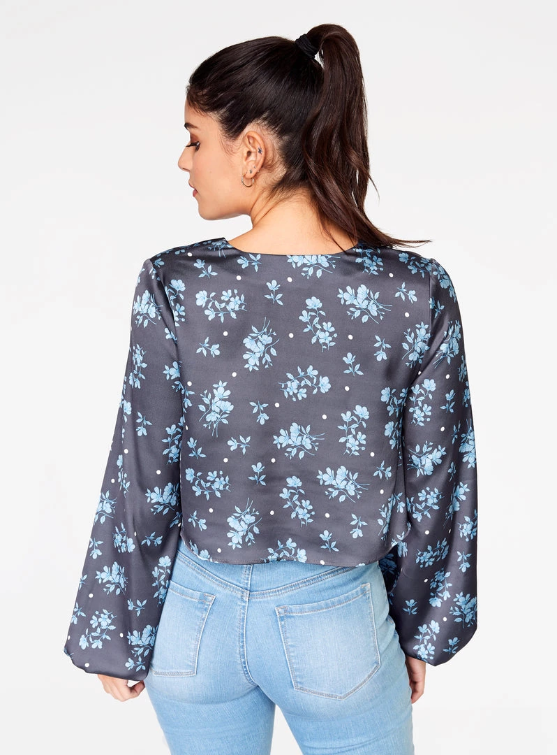 HeyYou Blue Floral Long Sleeve Cropped Blouse