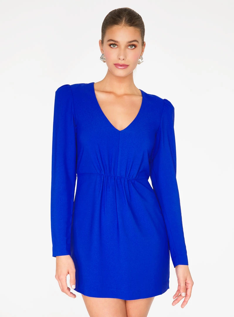 This classic mini dress offers hints of sexy in all the right places with a mini-length cut and deep V-neckline. The finer details include long sleeves with a puff sleeve, a hidden zipper back closure, and a full lining.
