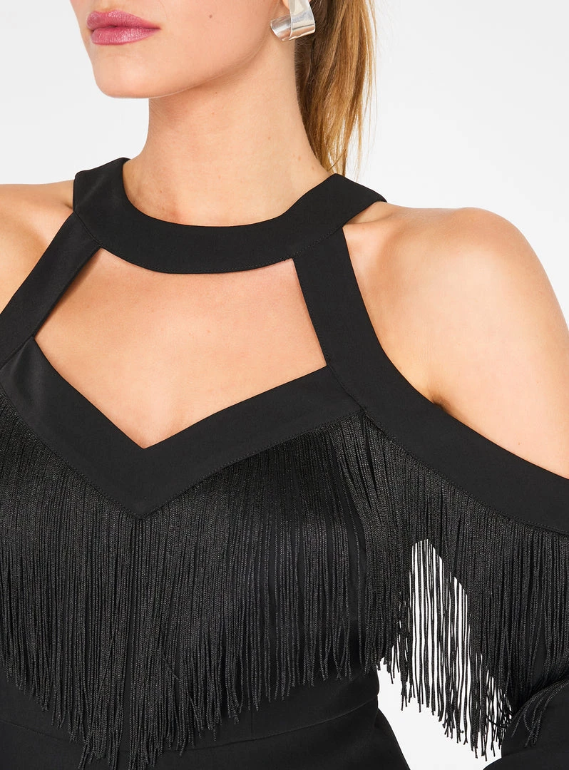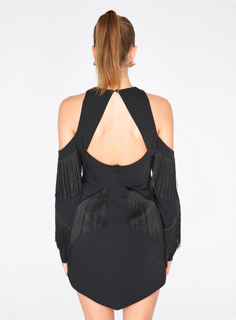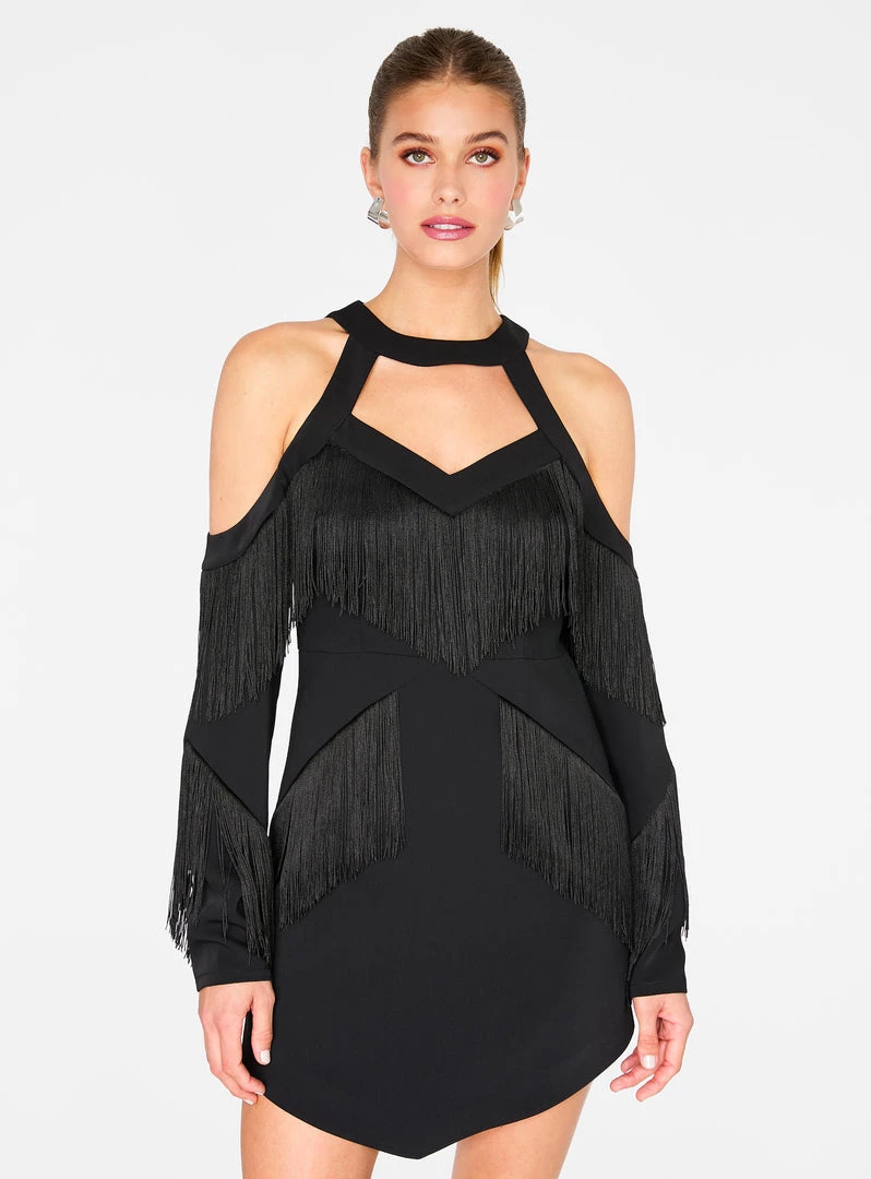 Channel the sexy flappers from the Roaring 20s with this fringe-filled dress that’s to die for. This mini-length dress features cut out detailing on the front and back, a flirty cold shoulder design, and a hidden back zip closure.